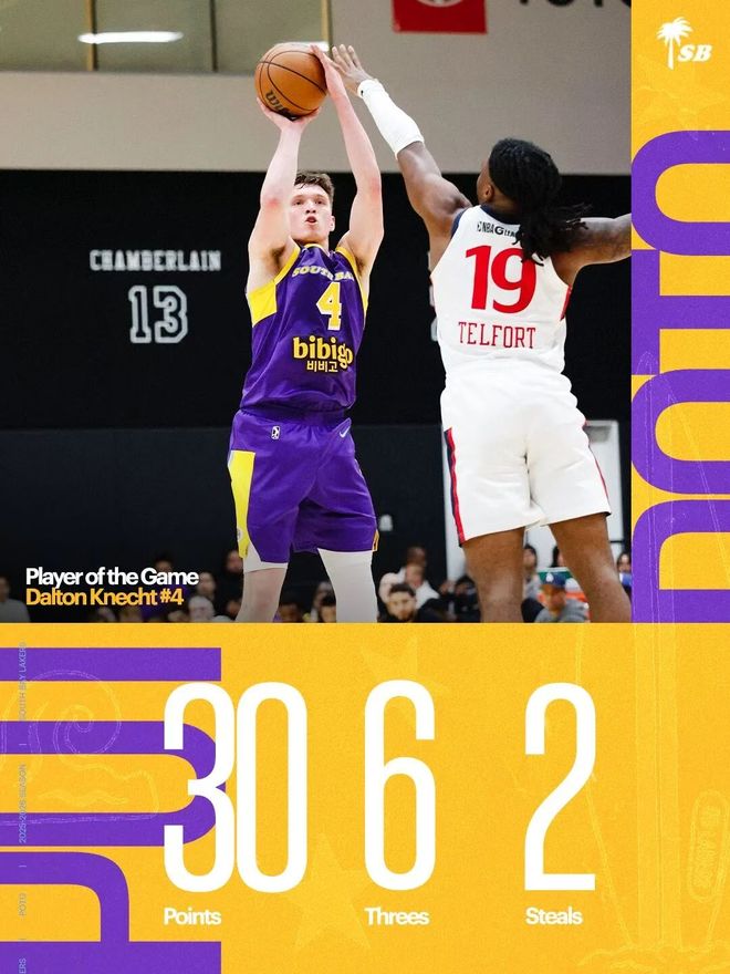 去年首轮第17顺位新秀多尔顿·克内克特,在被洛杉矶湖人下放后迎来G联赛首秀,便大发神威,全场17投10中,三分球10中6,狂砍30分5篮板2助攻2抢断1盖帽,当选全场最佳。然而,这场华丽表演的背后,并非苦尽甘来的励志故事,而是一曲透着凉意的“告别序曲”与“验货广告”。